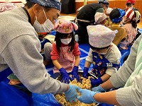 | 1月24日 味噌づくり コミセンこどもクラブ主催事業 この日は東部保育園の年中の園児さんと一緒に味噌づくり。こども倶楽部で収穫した大豆を使って共同作業です。園児さんたちが仕込んだお味噌は、1年後に年長さんになった時の給食で使用されます。2月には荘原保育園でも開催予定です。 |