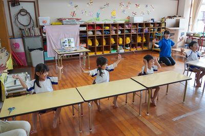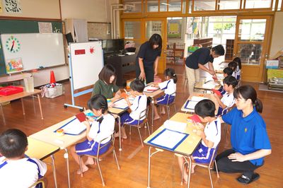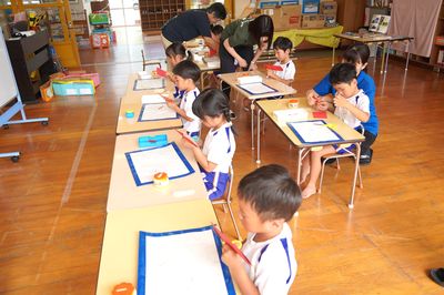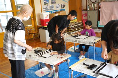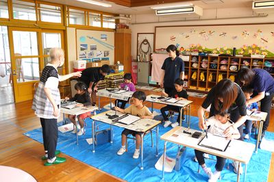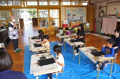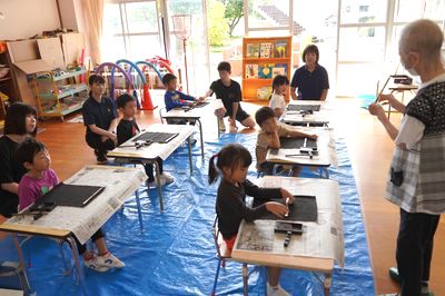 令和7年10月7日(火)の1コマです。職場体験2日目で、今日も中学3年生1名が見守ってくれました。小学校のマラソン大会の応援をした後、年中と年長は習字教室でした。習字名人の方に、筆の使い方を教えていただきました。年少は、製作活動をしました。