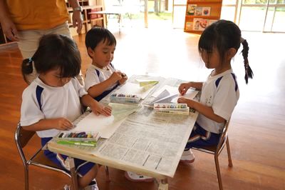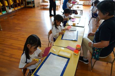 園に帰ってからは、コミセン祭りに出品する作品作りをしました。きれいな包装紙をちぎって飛行機に貼り付けました。楽しみながら作っているので、良い作品ができそうな予感がします。