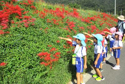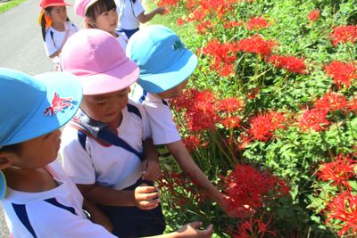 令和7年10月1日(水)の1コマです。今日は、近くの土手のヒガンバナが益々きれいになったので、もう一度みんなで見に行きました。昨日作ったヒガンバナが本物にそっくりでうれしかったです。たくさん咲いていてとてもきれいでした。