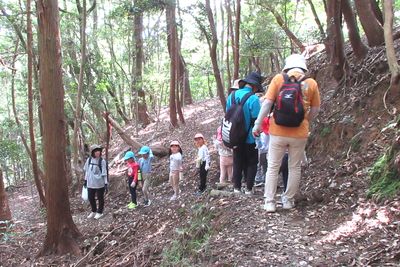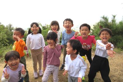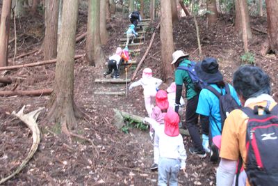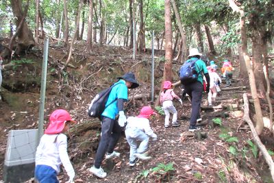 令和7年10月2日(木)の1コマです。今日は、園外保育で、鳶ヶ巣山に登りました。初めて登るので、どうなることかと少し心配しましたが、友だちと一緒に登ると、元気が出て、全員が山頂に登ることができました。