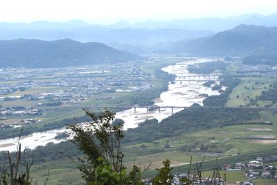 山頂からの眺めがとても良く、斐伊川や遠くの山並みが見えました。山頂で、ヤマタノオロチをスサノオノミコトが倒したお話を聞きました。斐伊川が巨大なオロチに見えました。
