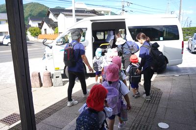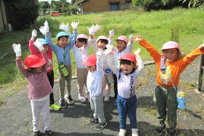 地域の方の協力で、毎年たけのこ掘りが体験できます。子どもたちは、今年もたけのこを見つけて大喜びでした。遙堪幼稚園の周りには、豊かな自然がたくさんあります。温かい人々に支えられて伸び伸びと学び、育ちます。 | 地域の方(畑の名人)に来ていただき、一年を通じて野菜を栽培しています。この日は、夏野菜の苗を植えました。野菜づくりの体験で、たくさんのことを学びます。旬の野菜はとてもおいしく、野菜好きが増えていきます。 | 天気の良い日は全園児で園外保育に出かけます。この日はお寺に行き、こいのぼりや池のこいを見ました。入園したばかりの年少も、最後まで歩きました。園外保育は、歩いて行くだけでなく、場所によってはバスを使って出かけます。 |
