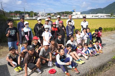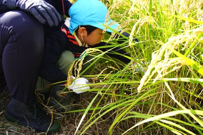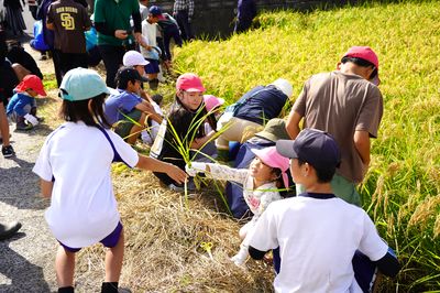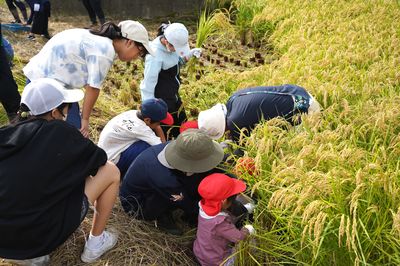 年長ひまわり組は、初めて鎌を使いました。年中すみれ組と年少もも組は、はさみで稲を刈りました。刈った稲は、小学生さんや職場体験のお兄さんが束ねて結んでくれました。たくさん体験できました。営農組合のみなさん、ありがとうございました。