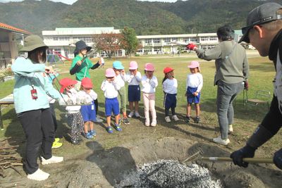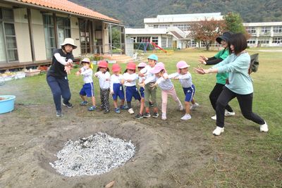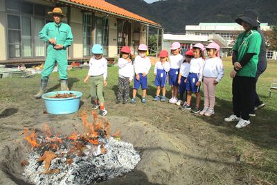 令和7年11月12日(水)の1コマです。今日は、焼き芋パーティーをしました。畑で収穫したさつま芋と畑名人さんからいただいたさつま芋を使って、焼き芋をしました。この日のために集めた落ち葉を使い、「おいしくなあれ」とおまじないをかけたので、とてもおいしい焼き芋ができました。