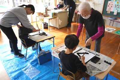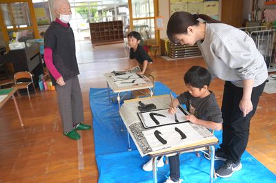 令和7年11月13日(木)の1コマです。今日は年長ひまわりと年中すみれ・年少ももに分かれて活動しました。年長ひまわりの2名は地域講師の方に来ていただき習字をしました。自分の名前の文字を上手に書きました。