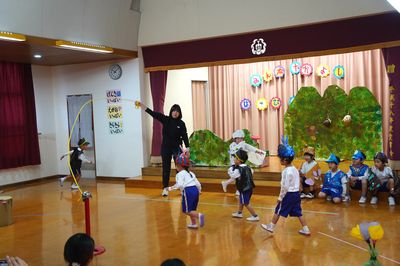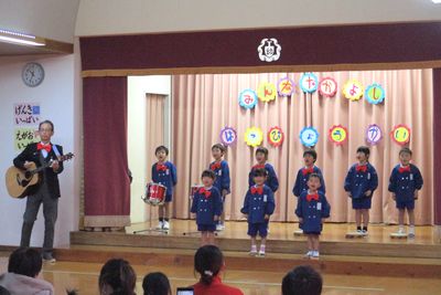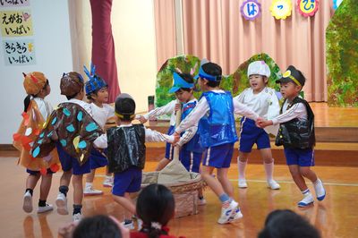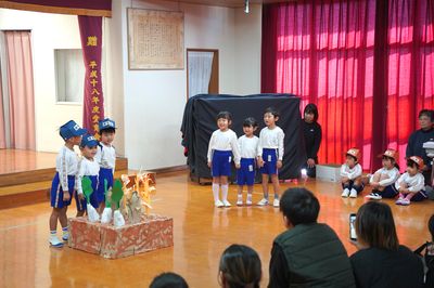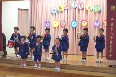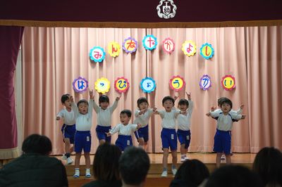 令和7年12月6日(土)の1コマです。太陽の日差しがまぶしい午前中でした。遙堪幼稚園の生活発表会を開催しました。たくさんのお客様に見守られながら、9名の園児たちは熱く演じました。