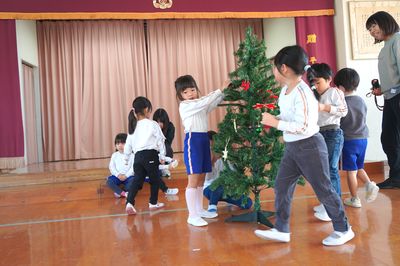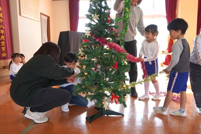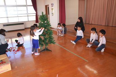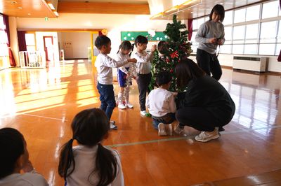 令和7年12月9日(火)の1コマです。振替休業日明けの火曜日です。今日は、クリスマス会に向けて、ツリーの飾りつけをしました。