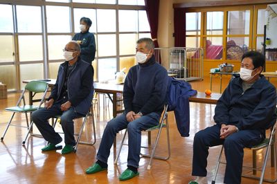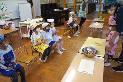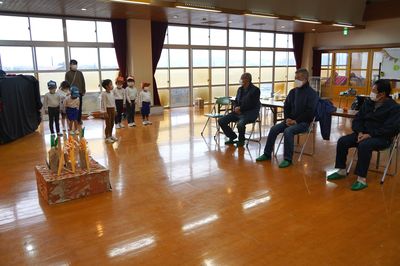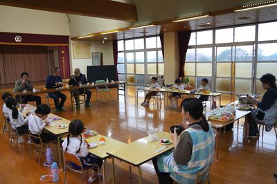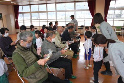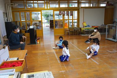 3名のお客さんと一緒に食べました。とてもおいしかったです。感謝の気持ちを伝えるために3つの手遊びを見ていただきました。田んぼ名人さん、畑名人さんありがとうございました。