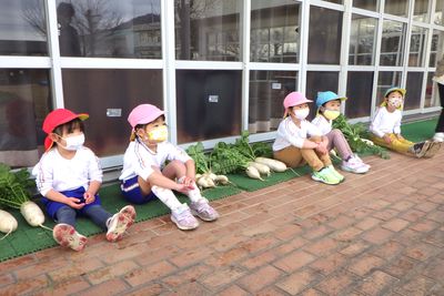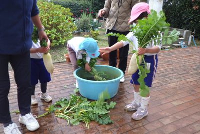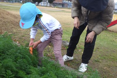 収穫した野菜は、本日持ち帰ります。家でもおいしく食べてください。今日お休みだった友だちは、元気になってから大根とにんじんの収穫をしてもらいます。早く元気になってほしいです。