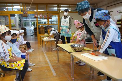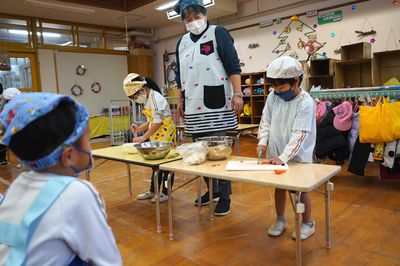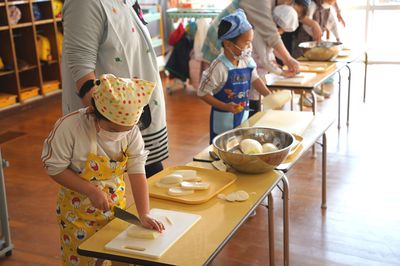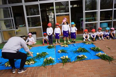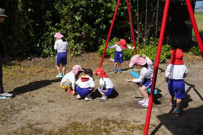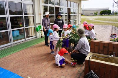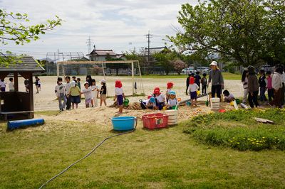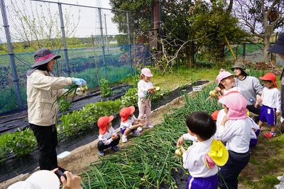 | 地域の方の協力で、毎年たけのこ掘りが体験できます。子どもたちは、今年もたけのこを見つけて大喜びでした。遙堪幼稚園の周りには、豊かな自然がたくさんあります。温かい人々に支えられて伸び伸びと学び、育ちます。 | 地域の方(畑の名人)に来ていただき、一年を通じて野菜を栽培しています。この日は、夏野菜の苗を植えました。野菜づくりの体験で、たくさんのことを学びます。旬の野菜はとてもおいしく、野菜好きが増えていきます。 | 天気の良い日は全園児で園外保育に出かけます。この日はお寺に行き、こいのぼりや池のこいを見ました。入園したばかりの年少も、最後まで歩きました。園外保育は、歩いて行くだけでなく、場所によってはバスを使って出かけます。 |