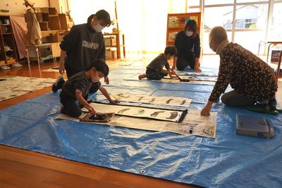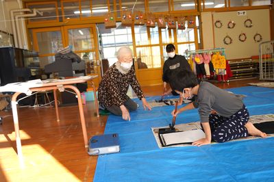 令和7年12月18日(木)の1コマです。今日は習字教室でした。年長ひまわり組の2人は、地域講師の習字名人さんに教えていただきながら大きな半紙に自分の名前を書きました。とてもいい字が書けました。
