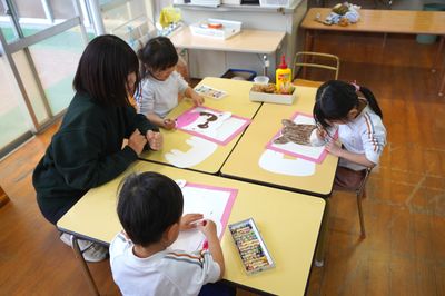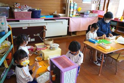 年中すみれ組、年少もも組は、お休みしていた時の作品作りをしました。習字名人さんありがとうございました。