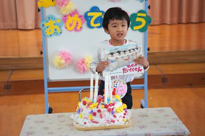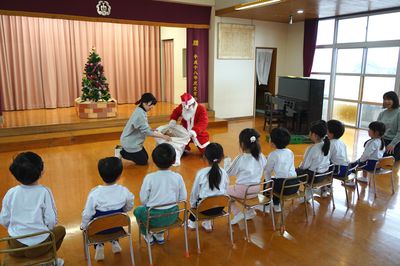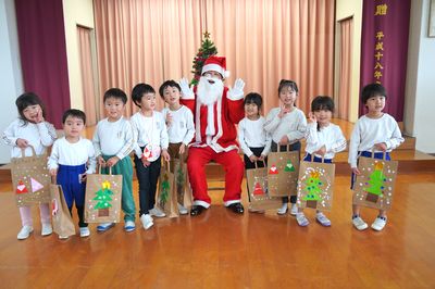 午後は12月の誕生会をしました。誕生会が終わると突然鈴の音が聞こえ、サンタさんが来てくれました。サンタさんから一人一人プレゼントをもらいました。本日、ご来園いただきました皆様、お陰様でとても良い一日になりました。ありがとうございました。