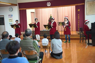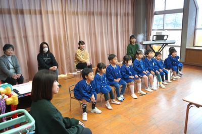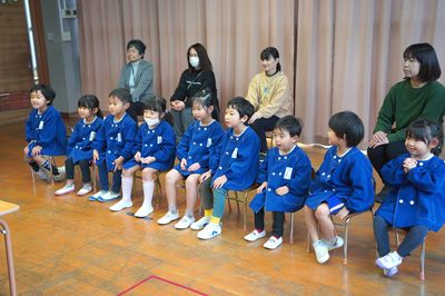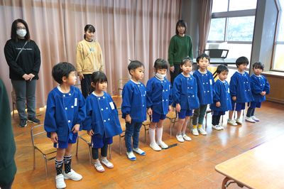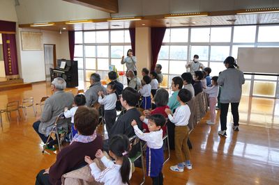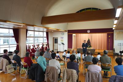 令和7年12月24日(水)の1コマです。今日はクリスマス誕生会、世代間ふれあい活動と盛りだくさんの一日でした。午前中は遙堪地区の高齢者クラブのみなさんにご来園いただき、「ママサンブル」さんの演奏を聴いたり、ふれあい活動をしたりして楽しく過ごしました。