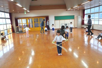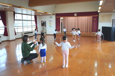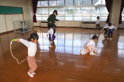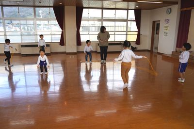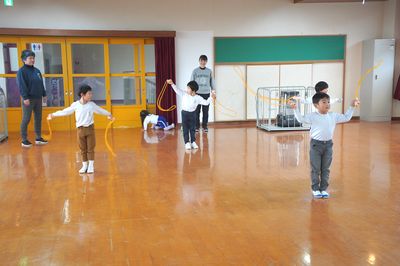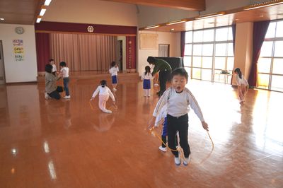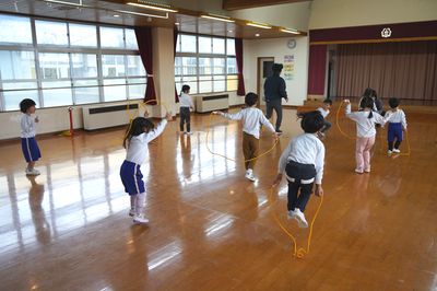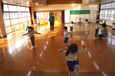 令和8年1月9日(金)の1コマです。遙堪幼稚園に賑わいが戻りました。遊戯室でなわとび遊びをする様子です。
