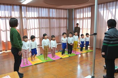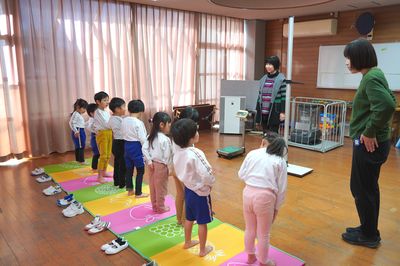 令和8年1月14日(水)の1コマです。今日は身体測定をしました。小学校の保健室の先生に来ていただき、身長と体重を測りました。その後は、なわとびをしたり、正月遊びをしたりしています。写真は、ふうせん羽根つきやこま回し、カルタ取りをしている様子です。