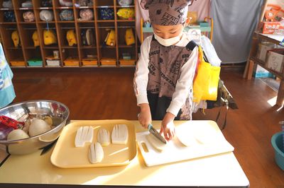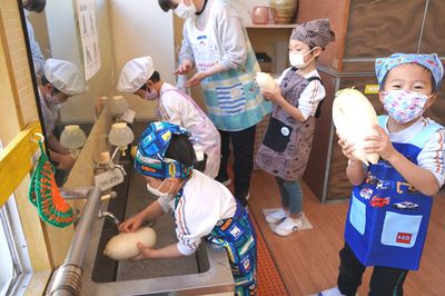 令和8年1月16日(金)の1コマです。大根をたくさん収穫したので、切り干し大根を作りました。初めての経験なので、やる気満々でした。まず最初に、大根をきれいに洗いました。その次に、年長ひまわり組と年中すみれ組は大根に切れ目を入れました。そして、年少もも組は、切れ目を入れてタコの足のようになった大根をハンガーにかけました。