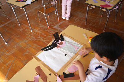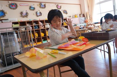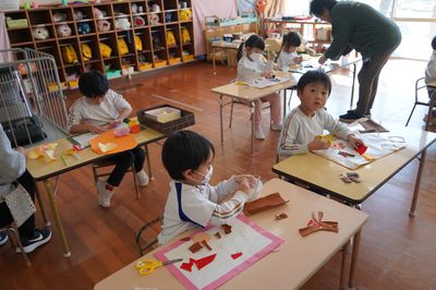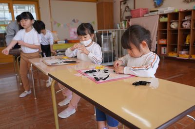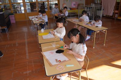 令和8年2月17日(火)の1コマです。気持ちの良い好天の日となりました。4月、遙堪小に入学する年長さんは、授業見学に出かけました。その頃、園では創作活動をしました。