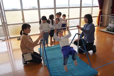 令和8年2月16日(月)の1コマです。2月も後半になりました。今週も楽しい1週間にしたいです。にこにこタイムで身体を動かしています。写真は鉄棒をしている様子です。