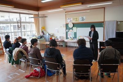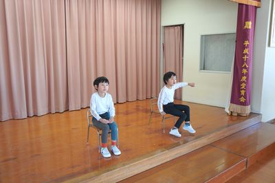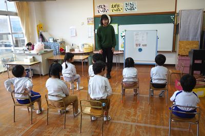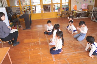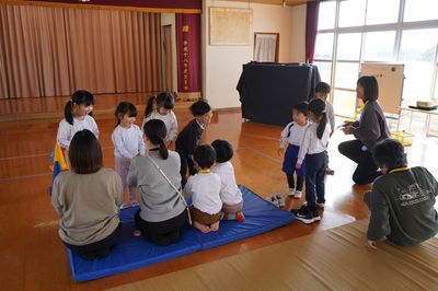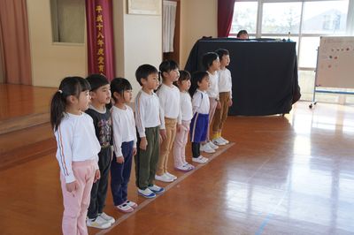 令和8年2月19日(木)の1コマです。明日が一日入園なので、新しい友だちを迎えるための練習をしました。歌のプレゼントの後、がんばっていることを発表します。