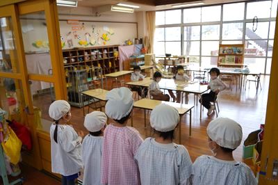 令和8年2月25日(水)の1コマです。給食の準備の様子をお届けします。1週間交替で当番をしています。年少は牛乳とストローを配り、年中・年長が盛り付けをします。当番以外の子どもたちは、自分の食事を盛り付けてもらいます。
