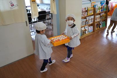 給食エプロン姿がかわいいです。くり返し経験することで上手になっていきます。