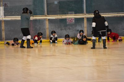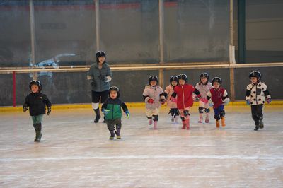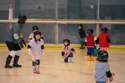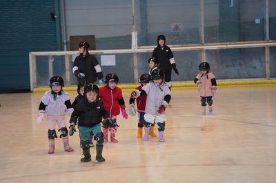 令和8年2月26日(木)の1コマです。今日は、お別れ遠足で、湖遊館に長ぐつスケートをしに行きました。氷の上で、立って滑ったり、寝転んで滑ったりして、氷で滑る感触を楽しみました。