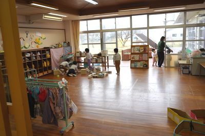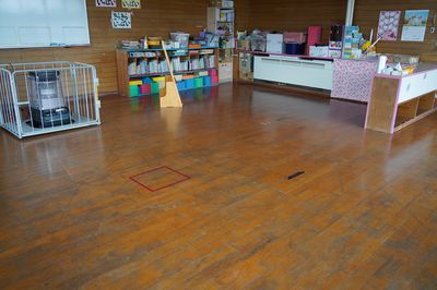遊戯室や預かりの部屋もワックスをかけてもらいます。本日の降園のお迎えは、保育室南側テラスに来ていただきますようお願いします。
