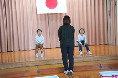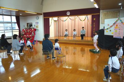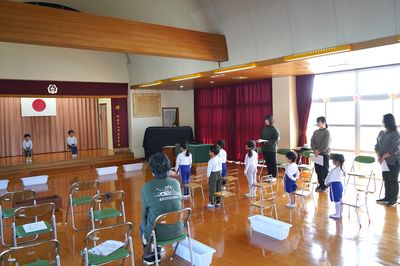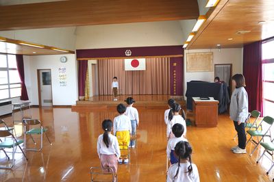 令和8年3月12日(木)の1コマです。卒園式に向けて、今日は全員で通し練習をしました。特に、主役の年長ひまわり組の2人は、修了証書をもらうこと、呼びかけや歌で思い出を伝えることをがんばりました。