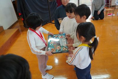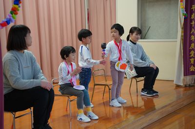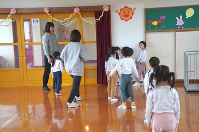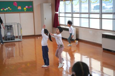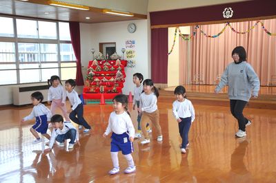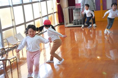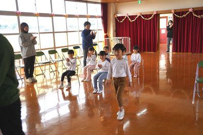 令和8年3月6日(金)の1コマです。今日はお別れ会をしました。年中すみれ組が上手に進行しました。バナナおにごっこやだるまさんが転んだで一緒に遊んだり、○×クイズをしたり、年少もも組が質問するコーナーもあり、とても良いお別れ会になりました。