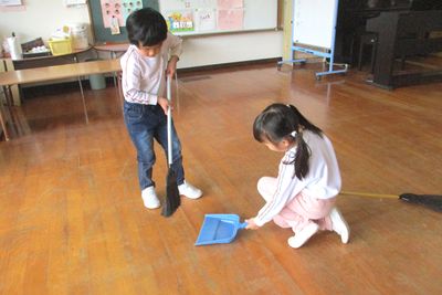 令和8年3月13日(金)の1コマです。年長さんと過ごす日も残り少なくなりました。外遊びの様子と掃除の様子です。