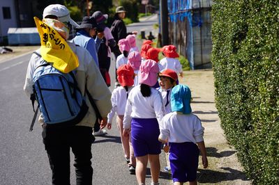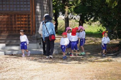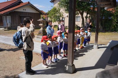 令和8年4月16日(木)の1コマです。今日は今年度初めての園外保育に出かけました。乙見神社まで、13人全員で歩いて行きました。年少もも組と年長ひまわり組が手をつなぐ、ほほえましい姿も見られました。