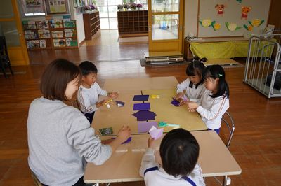 令和8年4月20日(月)の1コマです。新しい週が始まりました。外で「にこにこタイム(全園児活動)」をしました。にこにこタイムの後は、クラスごとに分かれて活動しました。ひまわり組は折り紙をしました。