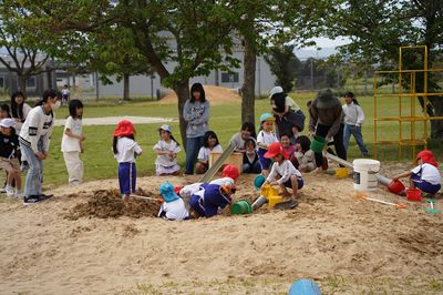 もも・すみれ組が砂場で遊んでいると、小学生のお姉さんが話しかけてくれました。休み時間にも交流できるところが、遙堪幼稚園の良いところです。