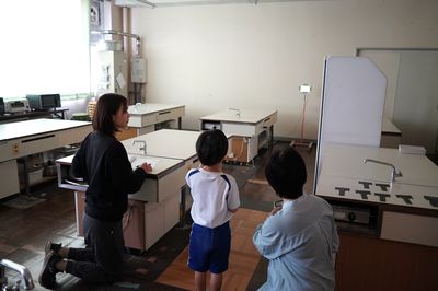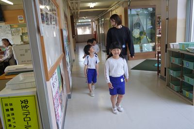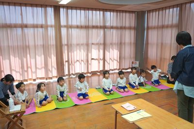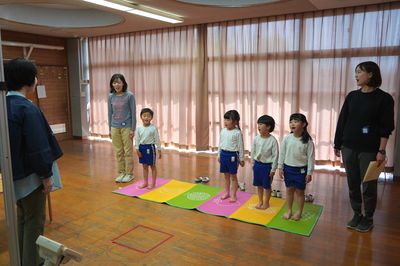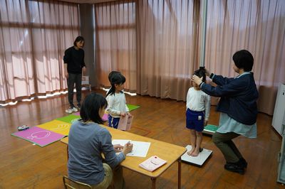 年長ひまわり組と年中すみれ組は、小学校に移動して、視力検査と聴力検査をしました。小学校の保健室の先生が測定をしてくださいます。