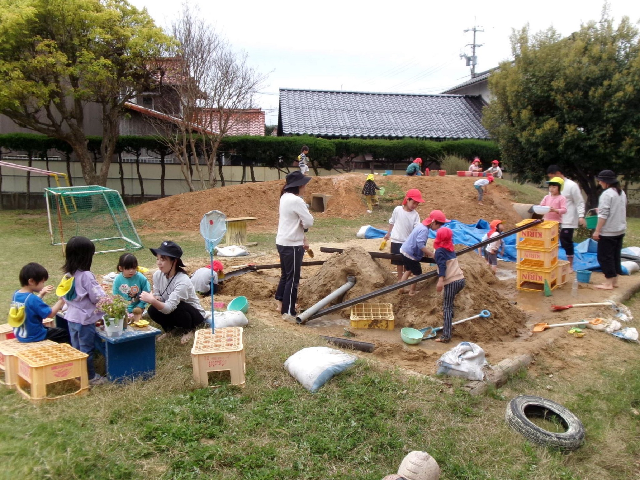 ランランタイムが始まりました。 どろんこ遊びを楽しんでいます。 さくら組・すみれ組、みんなで朝の会をしました。