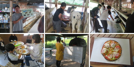 佐田町の伊藤牧場カウベルで、仔牛とのふれあい体験と、ピザ作りをしました。仔牛とのふれあい体験では、仔牛の心音を聴いたり、哺乳瓶からミルクを飲ませたりしました。またピザ作りでは、ひとりひとりピザ生地にトッピングして、釜で焼きました。焼きたてのピザはとても美味しかったです。あいにくの天気でしたが、友達、親子で楽しい時間を過ごすことができました。参加者は14人でした。