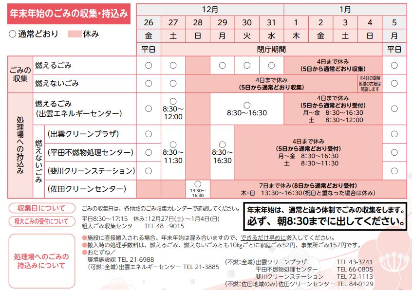 また、施設に直接搬入される場合、年末年始は混み合いますので、できるだけ早めに搬入いただきますようお願いします。