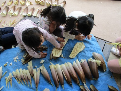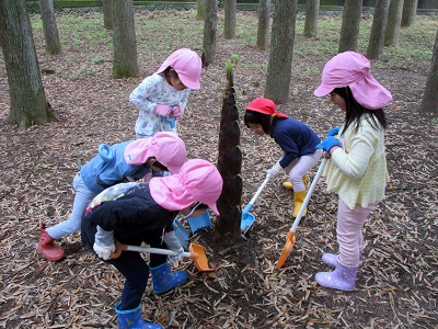 4月23日、地域の方にお世話になり、たけのこ掘りに出かけました。たけのこ山に到着するとすぐに「たけのこ発見!」「あのたけのこ大きい!」と大喜びでした。友達と力を合わせて自分より大きなたけのこを掘ったり、一人の力で最後まで頑張る姿が見られたりしました。たけのこを園に持ち帰ると、たけのこの節の数と皮の数が同じという大発見がありました。たけのこは煮物やメンマにして食べました。旬の味はおいしいですね。