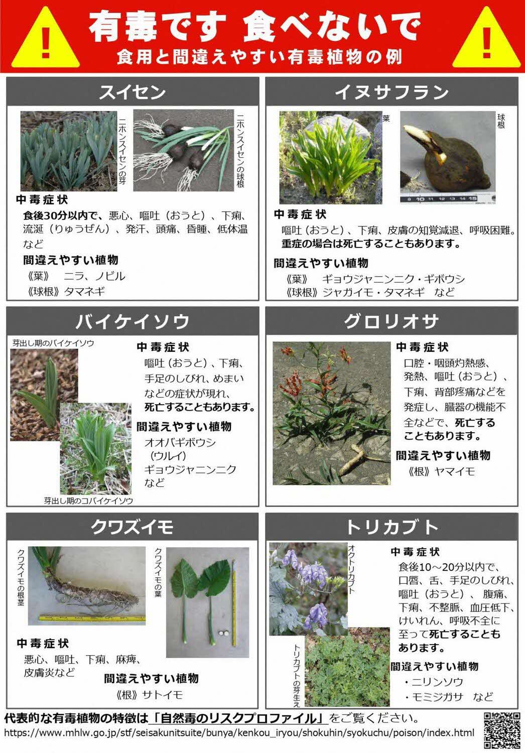 例年、特に春先から初夏にかけて、有毒植物の誤食による食中毒が多く発生し、イヌサフラン、トリカブト、スイセン等の有毒植物の誤食による食中毒事例が相次いで報告されています。