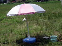 2013.6.24 ももちゃんが日焼けしてしまうので、桃色のパラソルを置きました。が、関係なく向こうの方の原っぱで反すう中です。 |