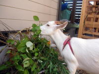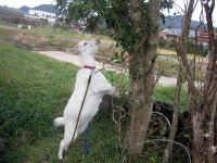 2013.10.14 ヤギは遠くのえさが欲しい時は膝を折って首を伸ばして食べます。だから膝がだんだん黒くなり、年をとると膝頭の毛がなくなってツルツルになることが多いようです。 |