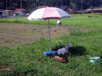 2013.8.14 真夏の炎天下、さすがにパラソルの下で休憩中です。向うで草刈りの中のWさん(上津コミュニティセンター職員)、汗だくでお疲れ様です。もう少し大きくなったらきっと手伝いますので。 |