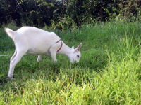 2013.8.18 そうはいってもこの頃になると、食べる草の量が急に多くなった気がします。杭で地面に繁留はしていますが、綱の届く範囲とその外側の草丈がはっきりと違うようになりました。 |