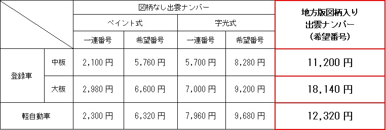 <参考:出雲ナンバー交付手数料一覧> ※2枚一組