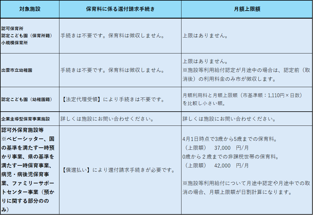 ★出雲市内の幼児教育・保育の無償化対象施設一覧 | 出雲市 (city.izumo.shimane.jp)(障がい児の児童発達支援等は除く)