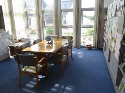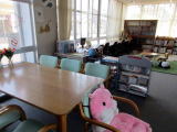 明るく開放的な図書室で、夏はゴザ、冬はホットカーペットの上でくつろいで過ごせる場所です。乳幼児も利用しやすいように、おもちゃなども置いています。