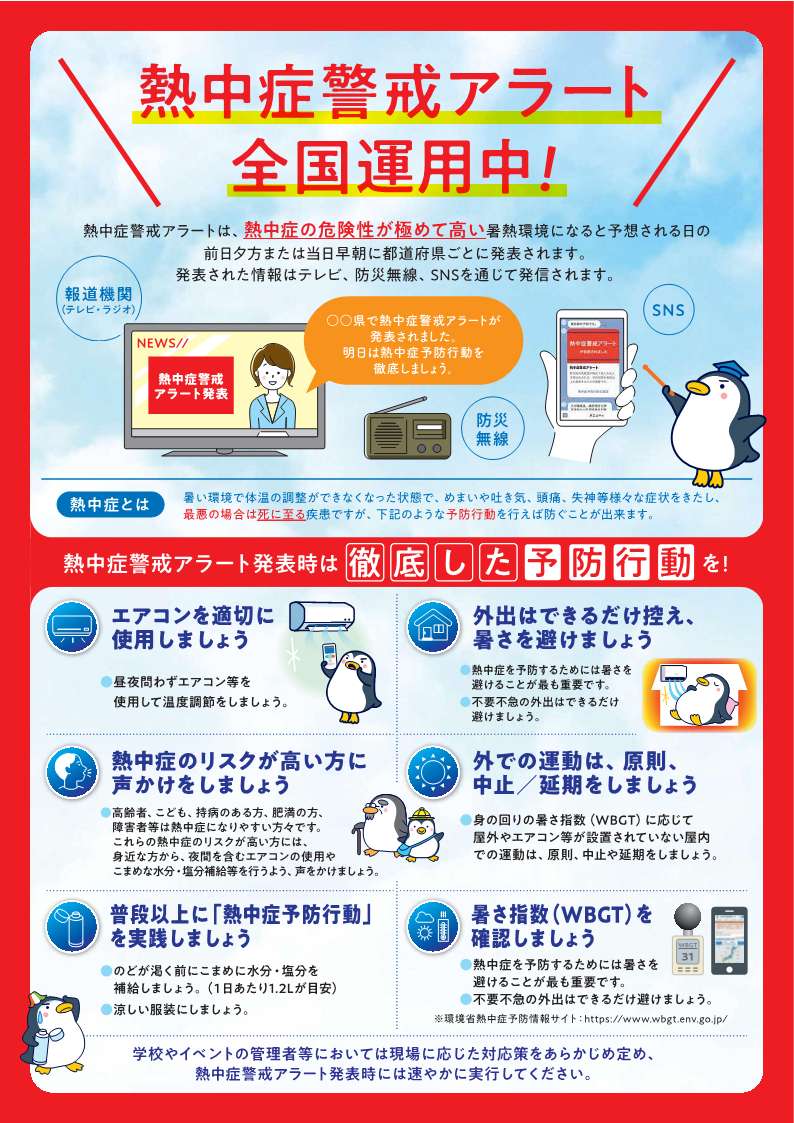 また、環境省および気象庁では、熱中症警戒アラートの運用を開始しています。詳細については、下記をご確認ください。