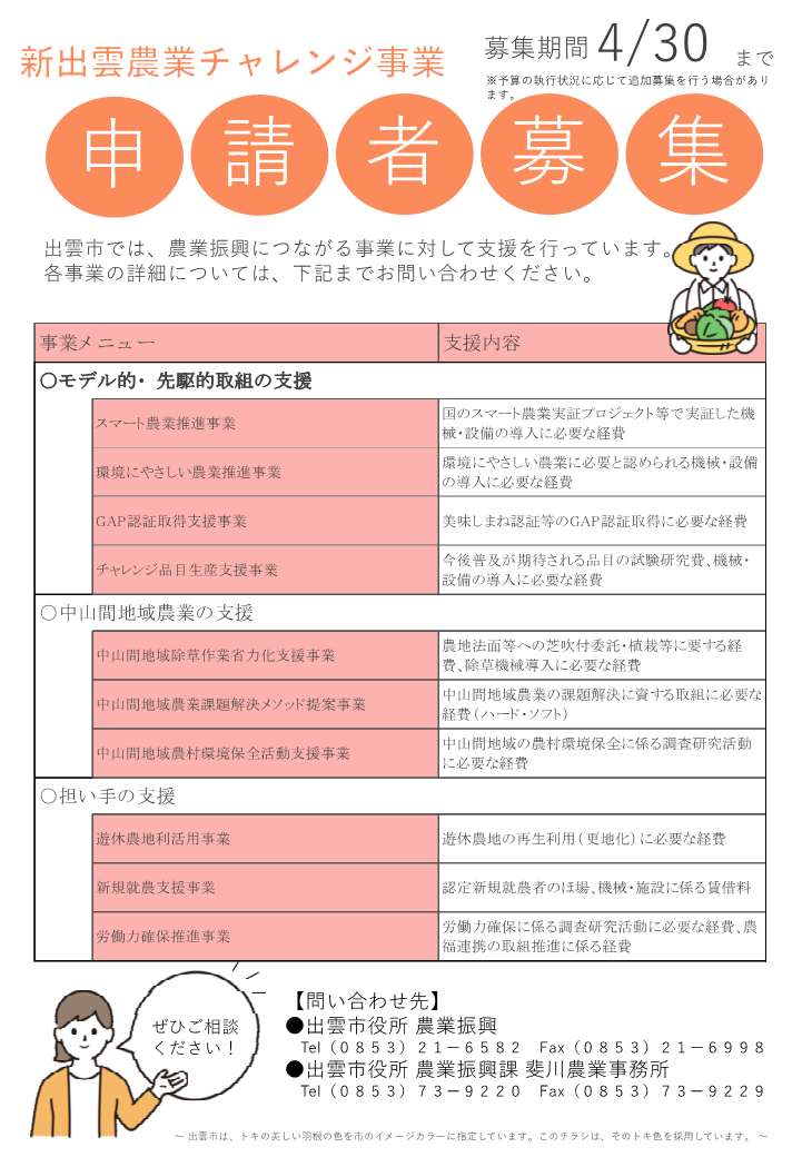 農業振興課(0853-21-6582)または、斐川農業事務所(0853-73-9220)までお問い合わせください。